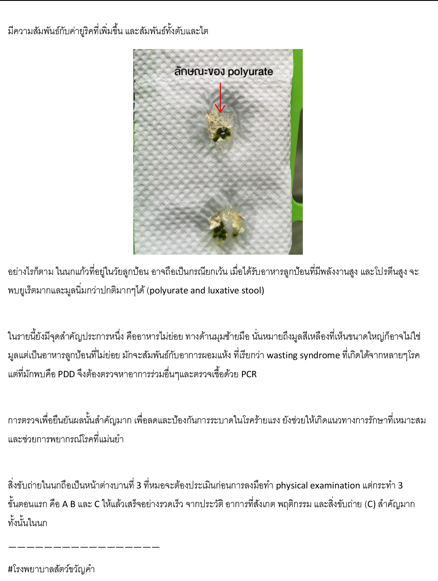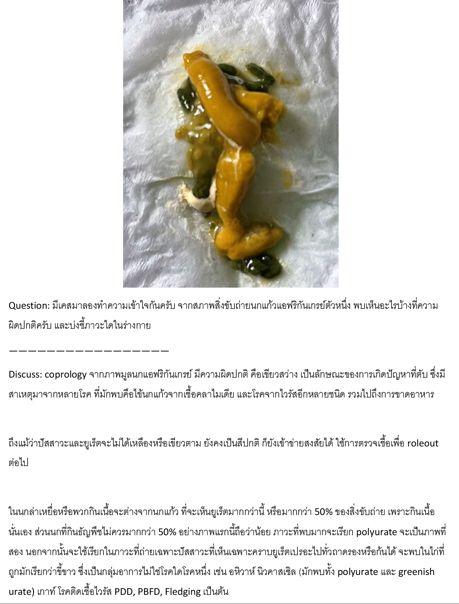 Question: มีเคสมาลองทำความเข้าใจกันครับ จากสภาพสิ่งขับถ่ายนกแก้วแอฟริกันเกรย์ตัวหนึ่ง พบเห็นอะไรบ้างที่ความผิดปกติครับ และบ่งชี้ภาวะใดในร่างกาย