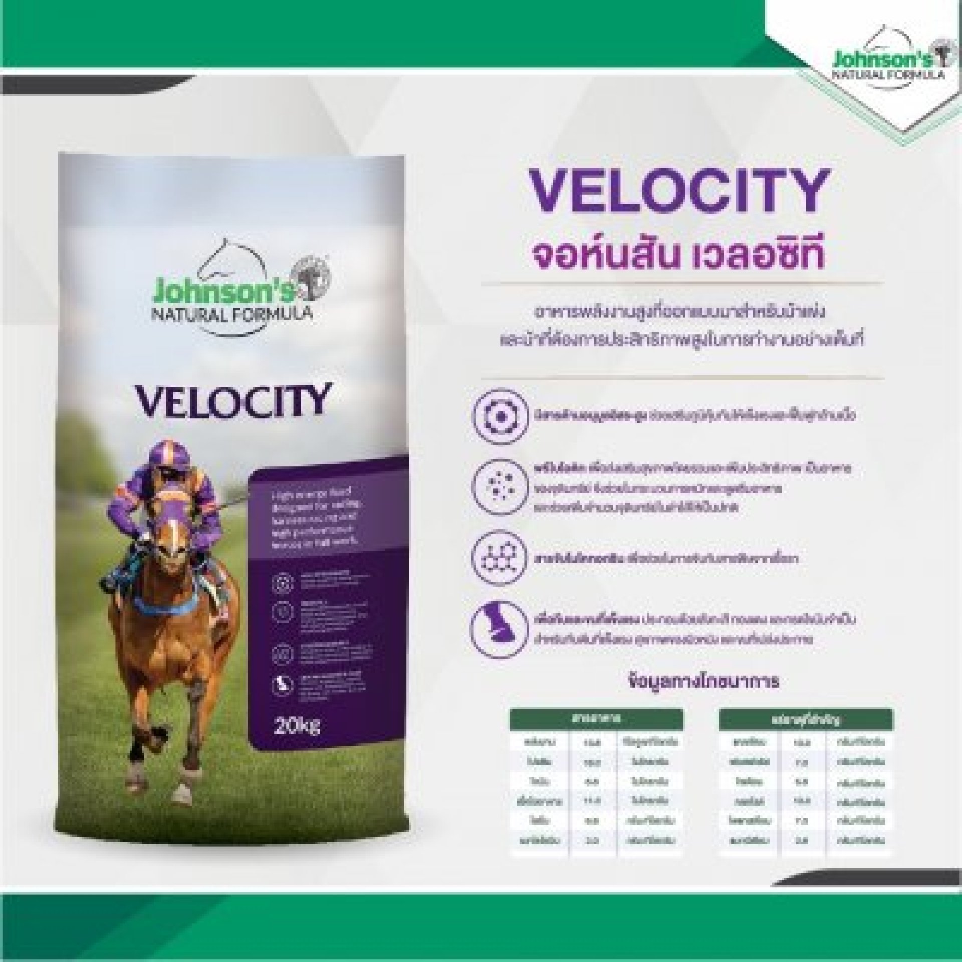 // จอห์นสัน เวลอซิที // เป็นอาหารเม็ดที่ให้พลังงานสูงและสมดุลเป็นอย่างดี ออกแบบมาเพื่อให้พลังงานที่ใช้งานได้ ยั่งยืนและปลอดภัยในการแข่งและการควบคุมม้าในการทำงานปานกลางถึงหนัก ไม่ว่าจะเป็นม้าแข่งขัน หรือม้าที่ต้องการพลังงานมากขึ้น มีสารต้านอนุมูลอิสระสูงเพื่อช่วยในการฟื้นฟูจากการทำงานหนัก รวมถึงพรีไบโอติกและโปรไบโอติกเพื่อรักษาสุขภาพของลำไส้ที่ดีที่สุด และมีสารจับไมโคทอกซินจากเชื้อรา เพื่อช่วยป้องกันสารพิษจากเชื้อราที่อาจส่งผลต่อสุขภาพและประสิทธิภาพการทำงาน