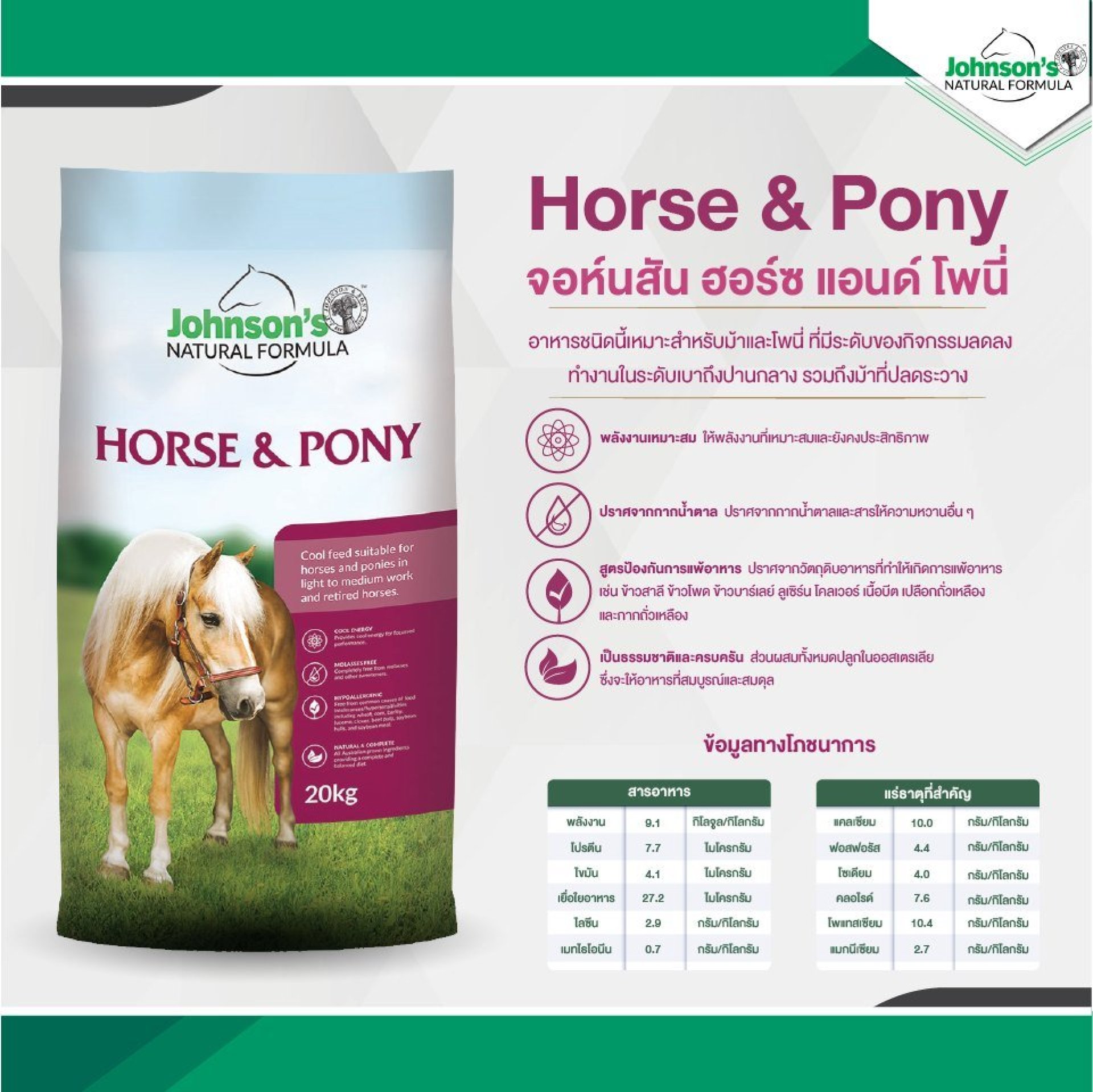 จอห์นสัน ฮอร์ซ แอนด์ โพนี่ เป็นอาหารเม็ดที่มีเยื่อใยอาหารสูง สมดุล และประหยัด ซึ่งถูกออกแบบมาเพื่อให้พลังงานที่ปลอดภัยและยั่งยืน