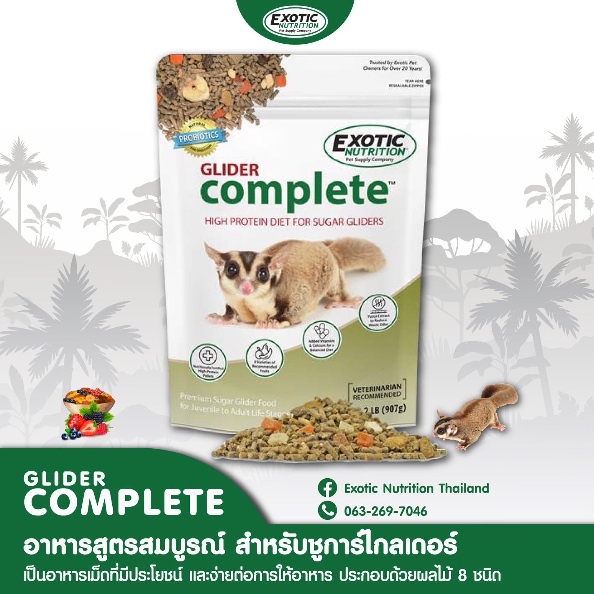 เป็นอาหารเม็ดสำหรับชูการ์ไกลเดอร์ที่สมบูรณ์ มีประโยชน์ และง่ายต่อการให้อาหาร ซึ่งประกอบด้วยผลไม้แท้ 8 ชนิด สร้างความหลากหลายให้อาหารในระดับพรีเมี่ยม มีอัตราส่วนของวิตามินและแร่ธาตุที่เหมาะสม ดังนั้นจึงไม่จำเป็นต้องมีอาหารเสริมเพิ่มเติมเมื่อรับประทานเป็นอาหารหลัก ทำให้เกิดความเพลิดเพลินในการกินอาหารประจำวันของสัตว์เลี้ยงของคุณ!